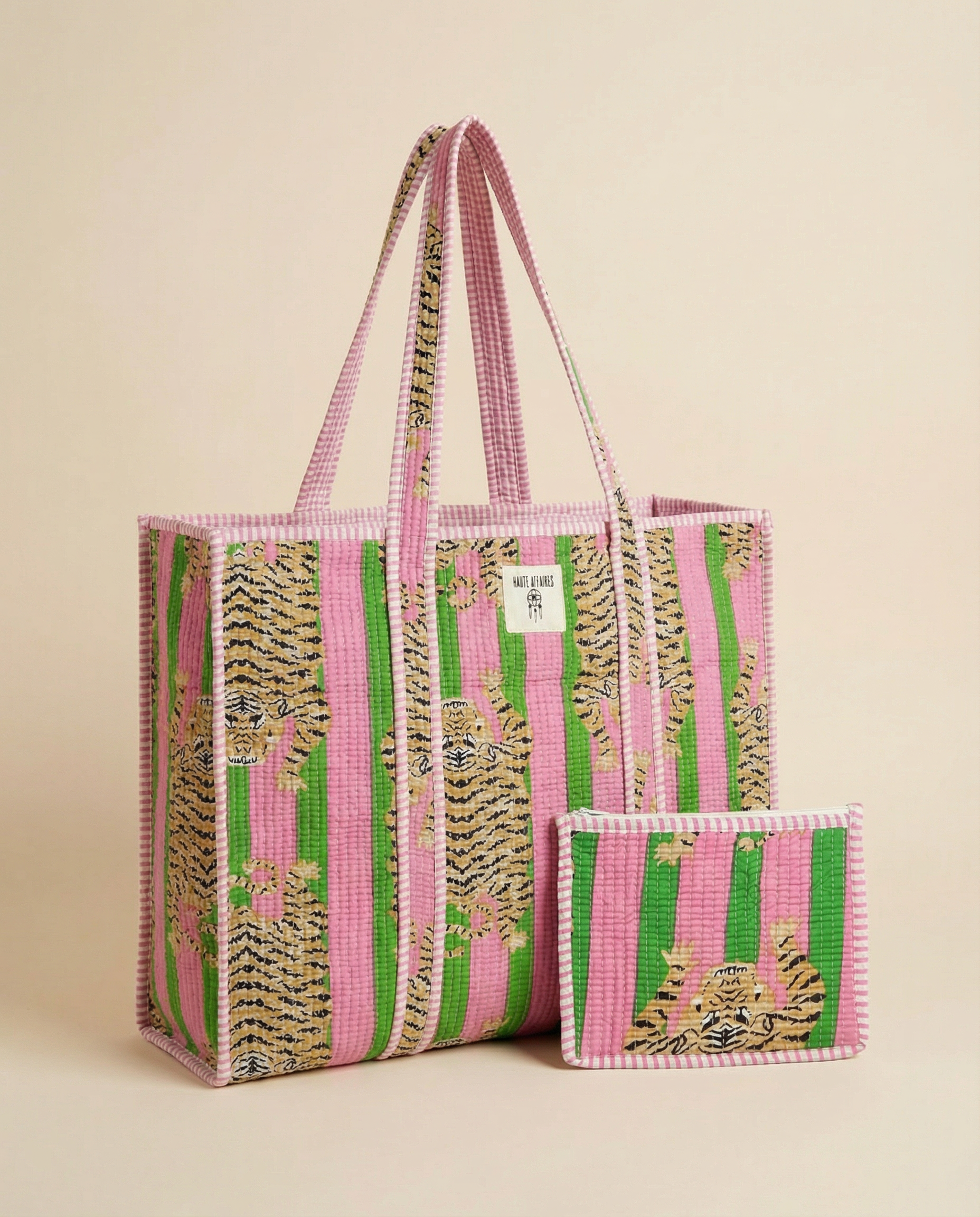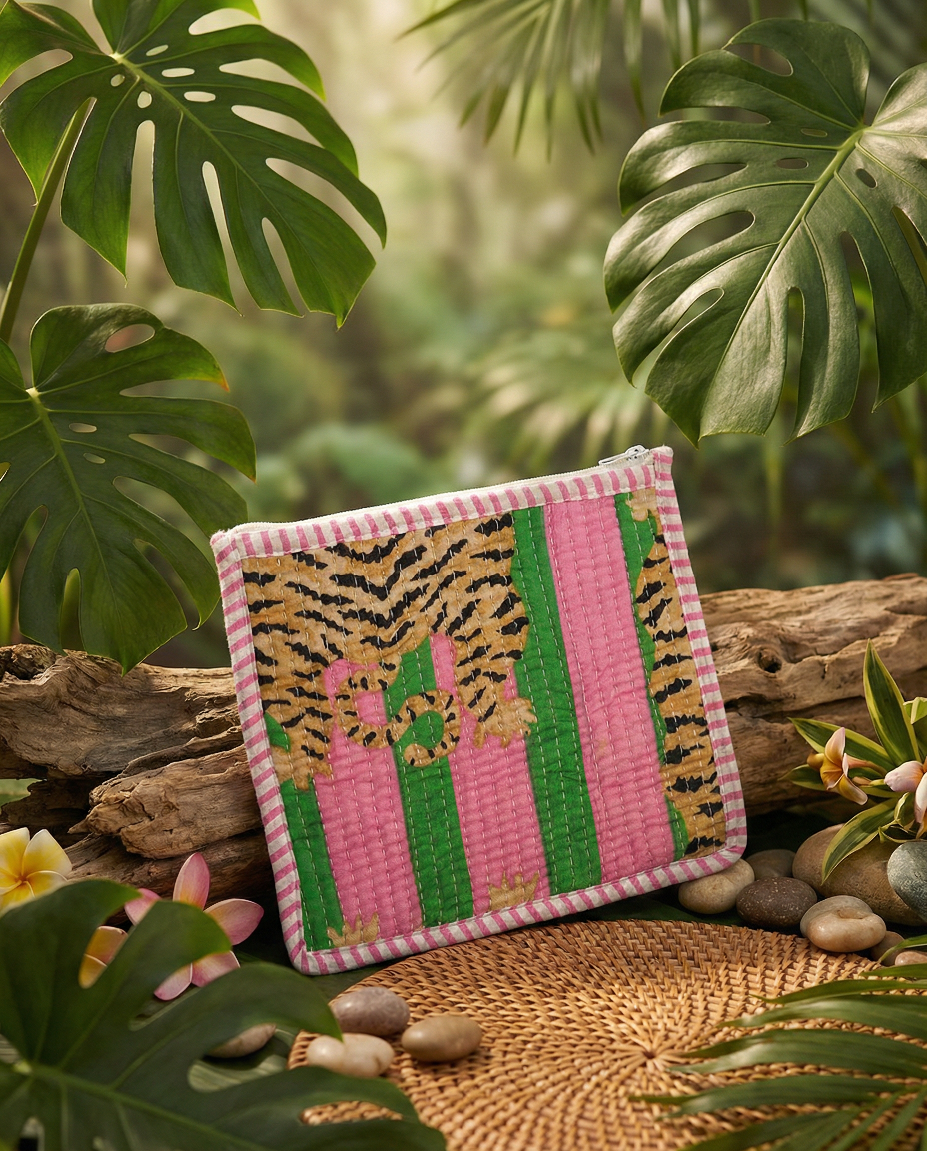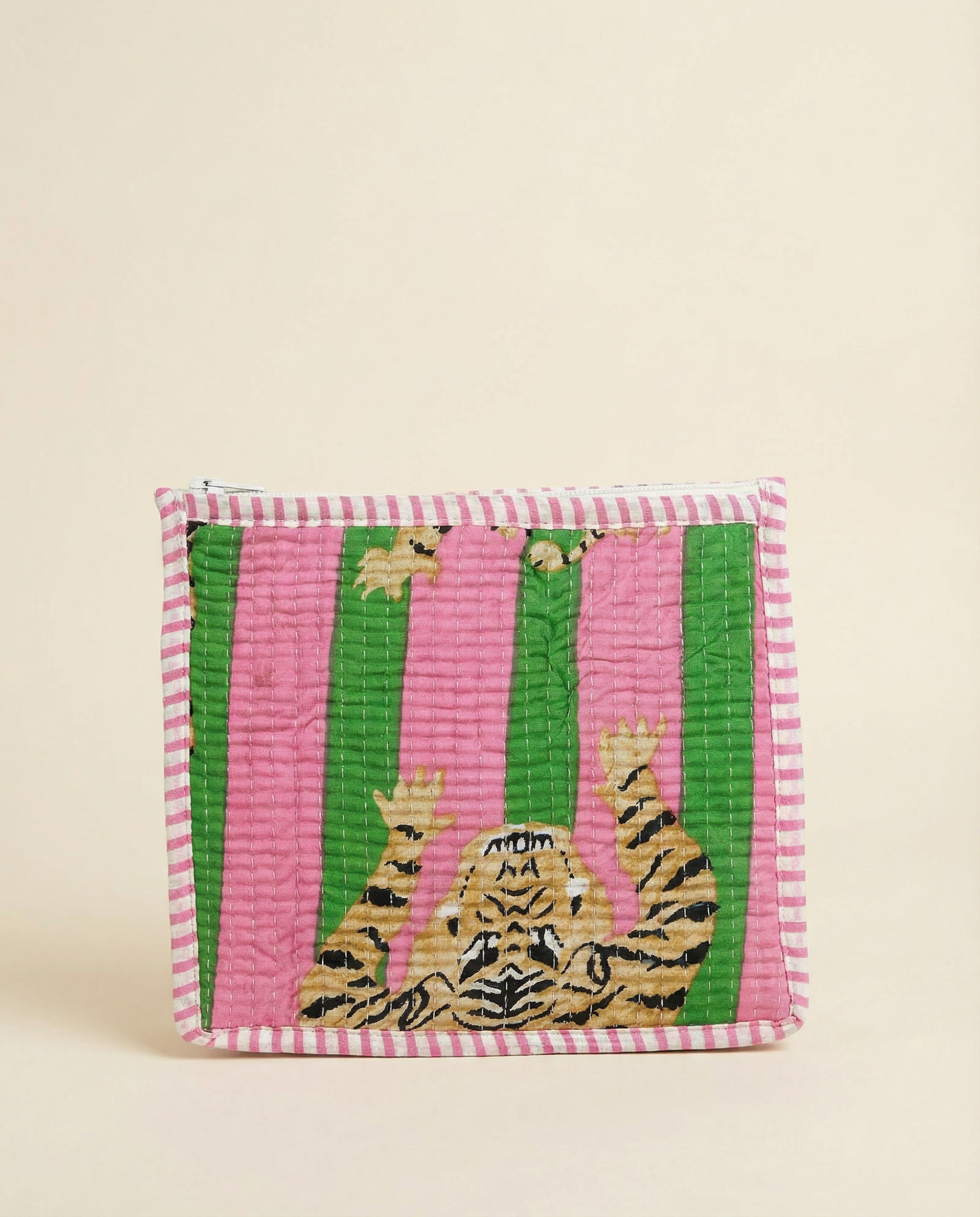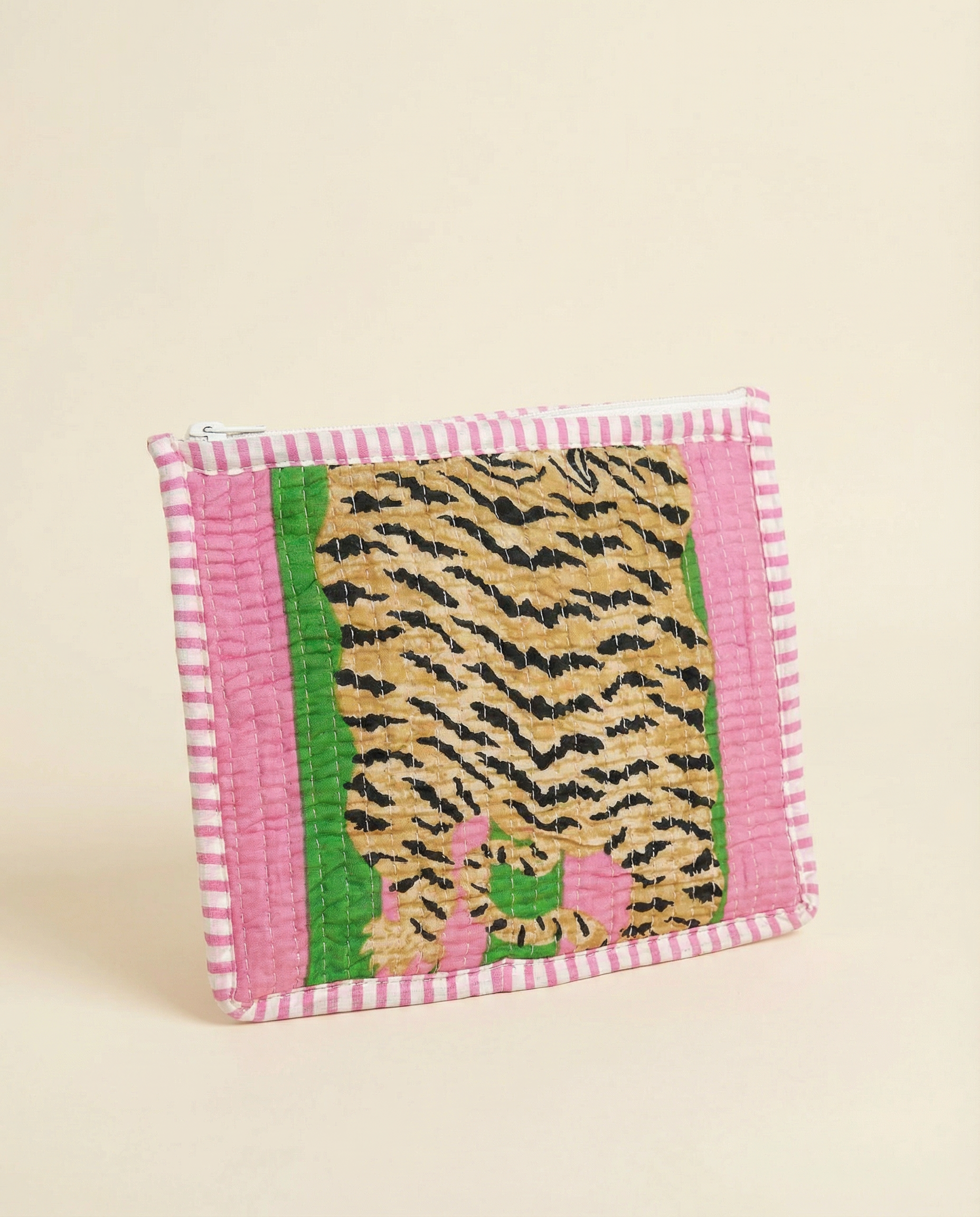 Playful yet polished, the Pink Tiger Stripe Quilted Pouch is crafted from soft quilted cotton and features our signature tiger stripe print with bold pink and green accents. Perfectly sized for cosmetics, tech accessories, or small essentials, it’s an easy organizer that adds personality to any tote.