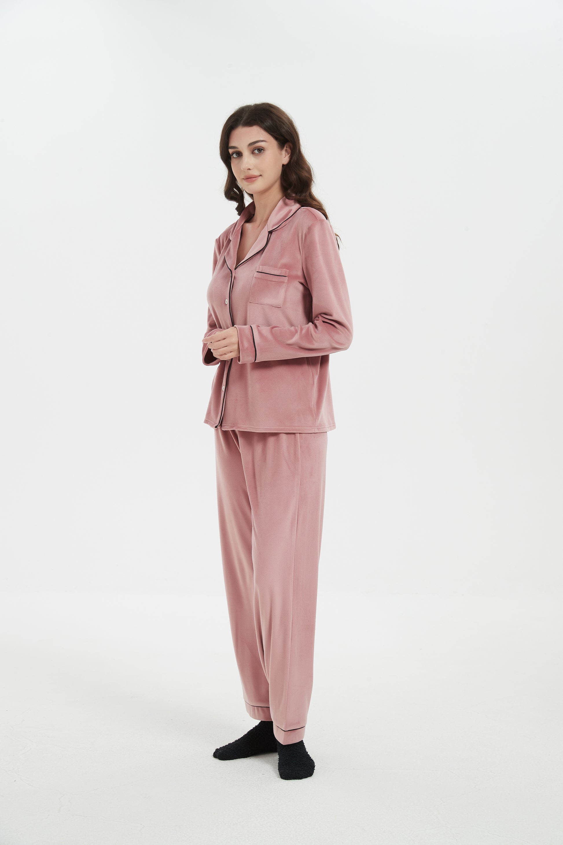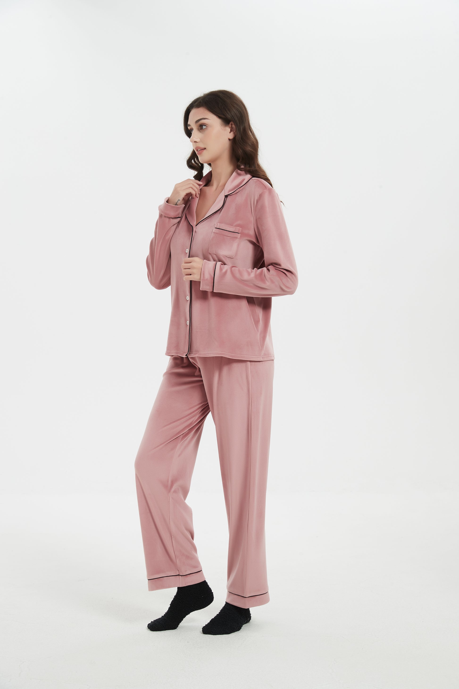 Plush velour cozy comfort women's Notch Collar pajama set with matching Chenille socks set. Soft and Luxurious feel all night long.