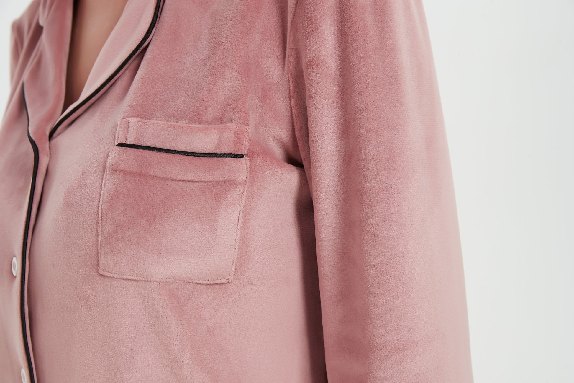 - Shirt: Notch collar contrast binding button front, long sleeves and pocket.