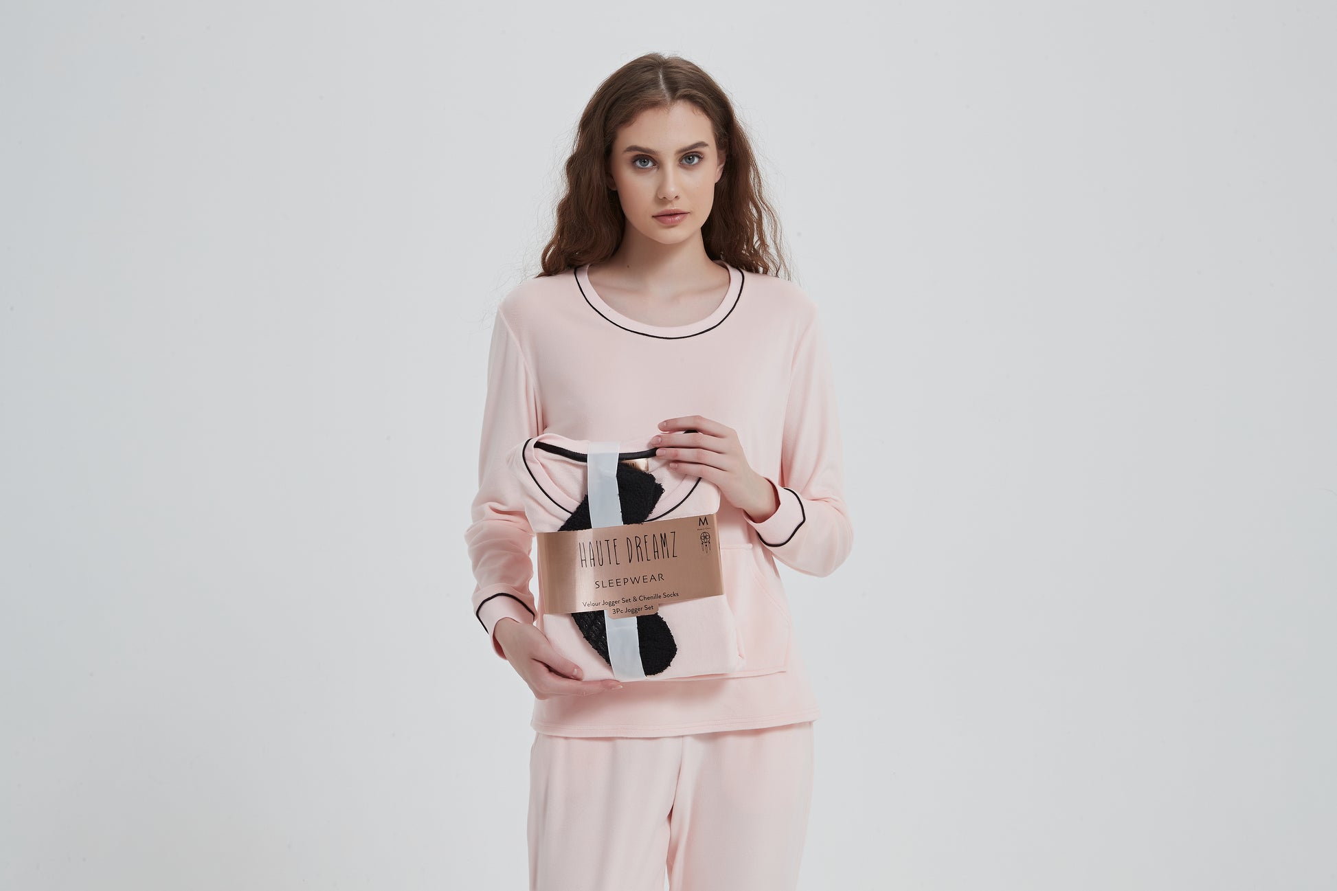 Plush velour cozy comfort women's jogger gift set with matching Chenille socks set. Soft and Luxurious feel all night long.