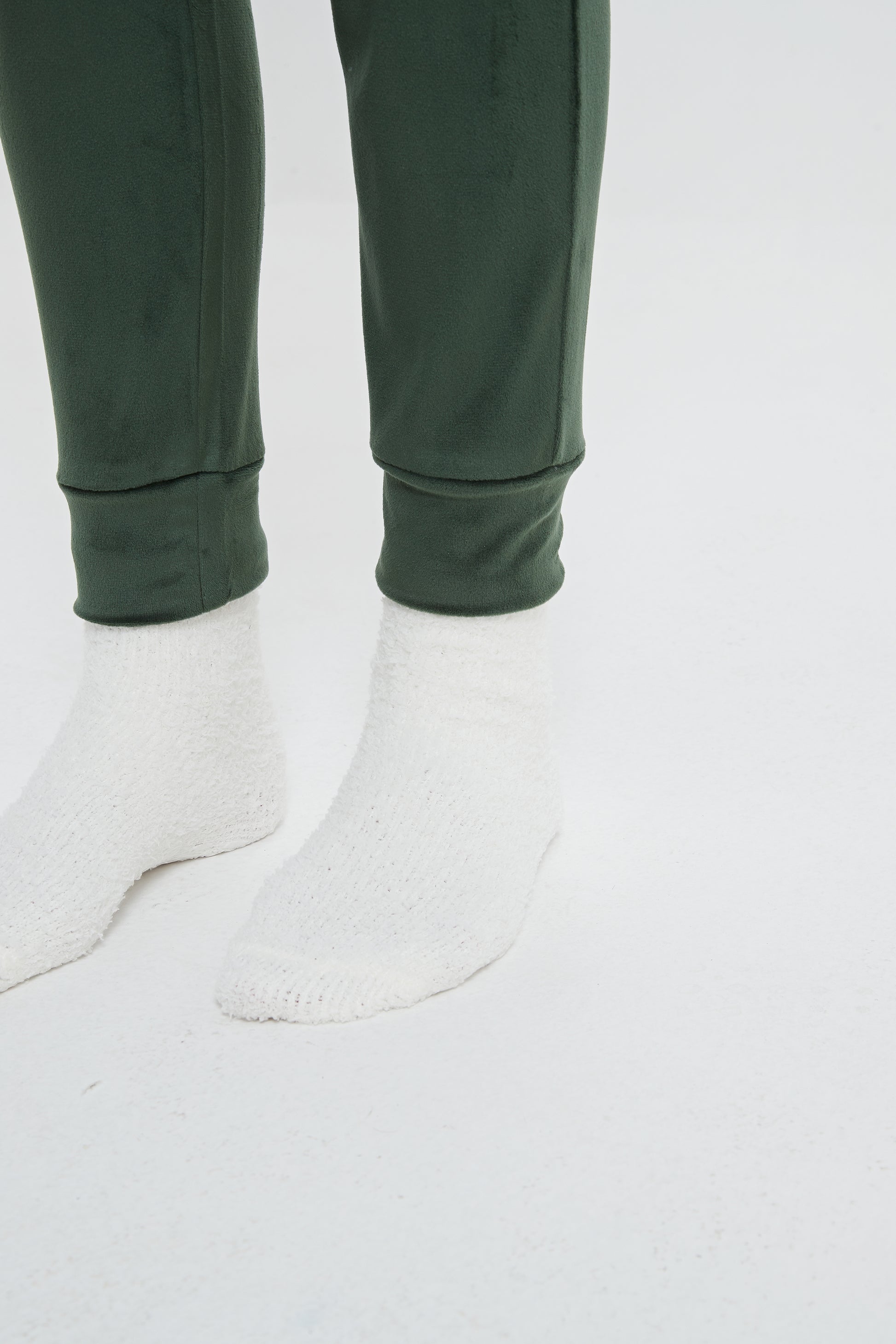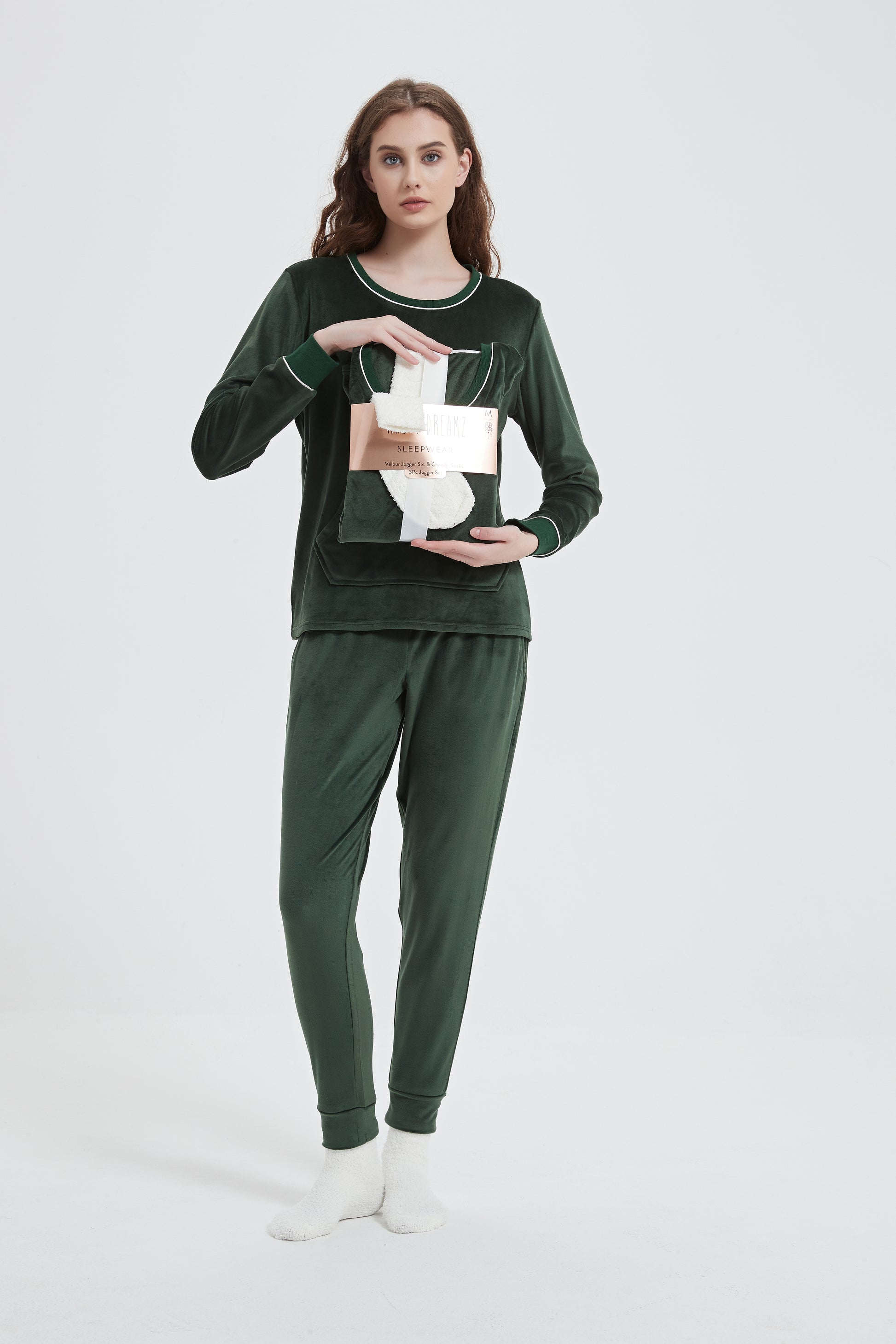 Plush velour cozy comfort women's jogger gift set with matching Chenille socks set. Soft and Luxurious feel all night long.