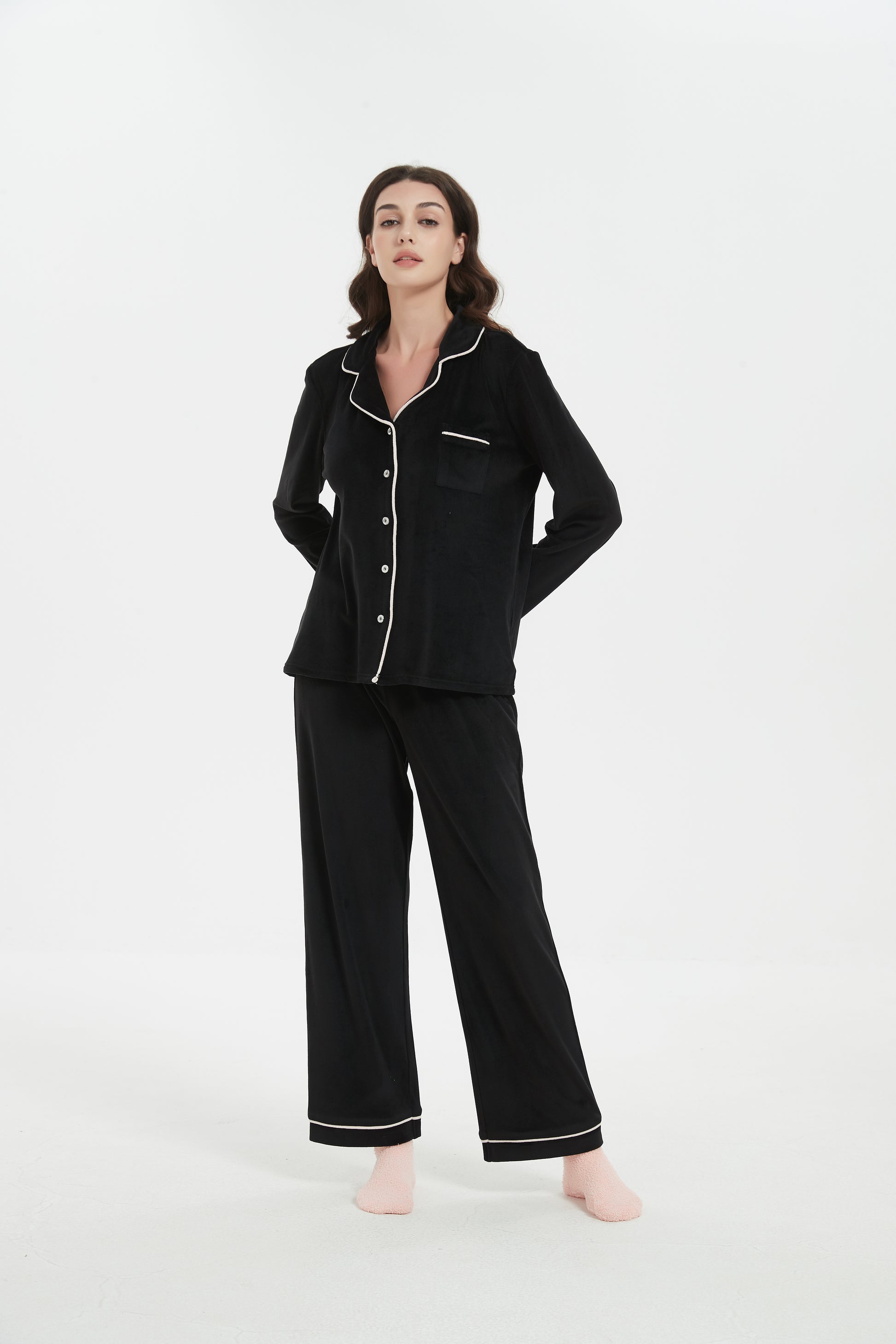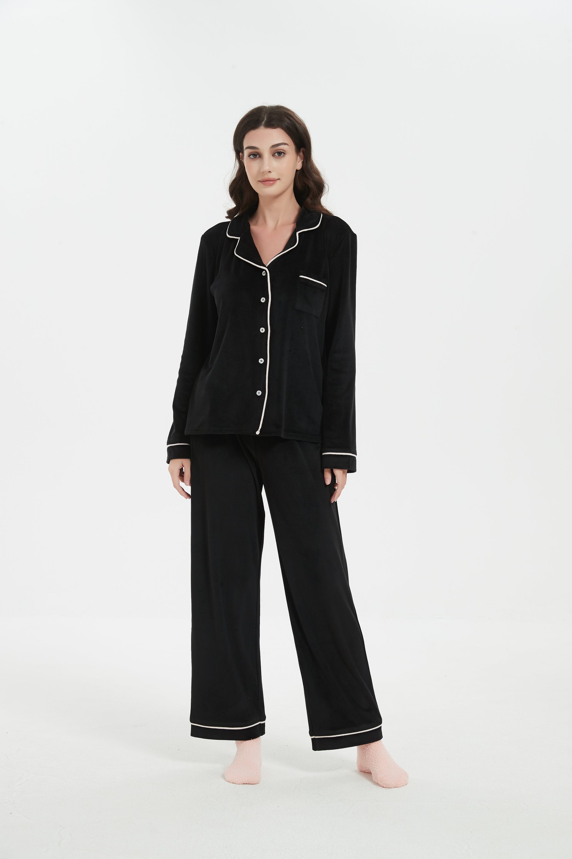 Plush velour cozy comfort women's Notch Collar pajama set with matching Chenille socks set. Soft and Luxurious feel all night long.