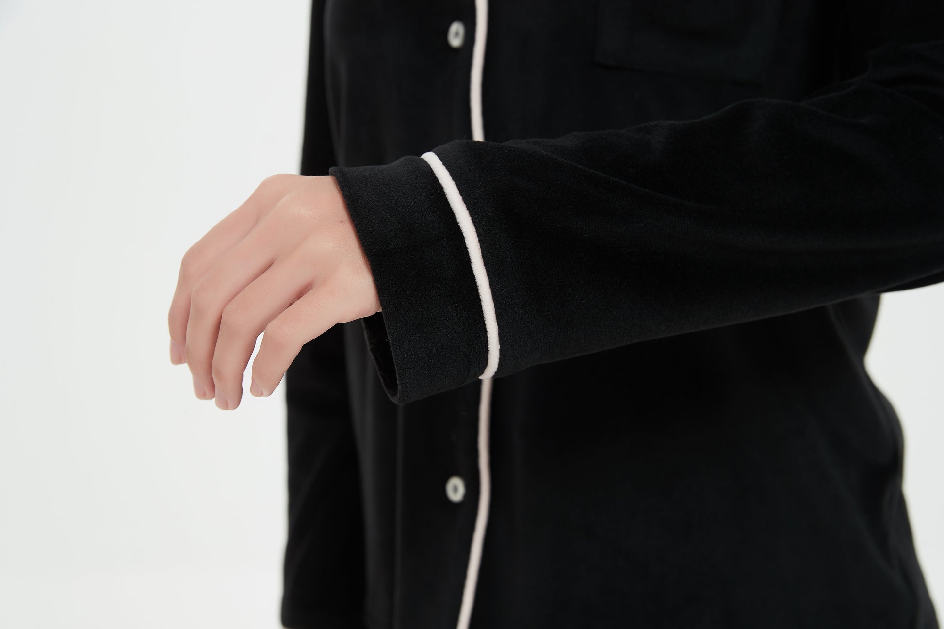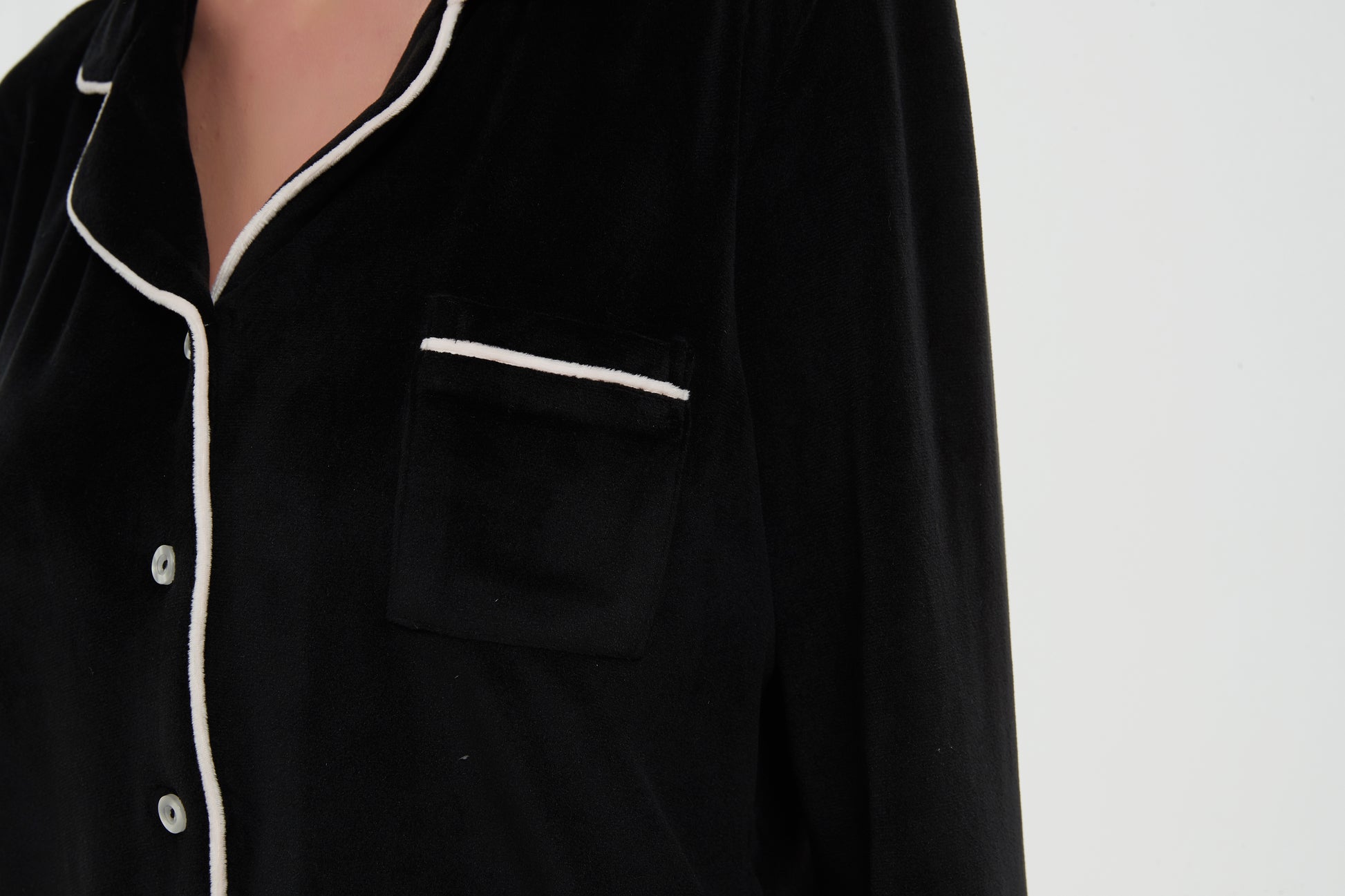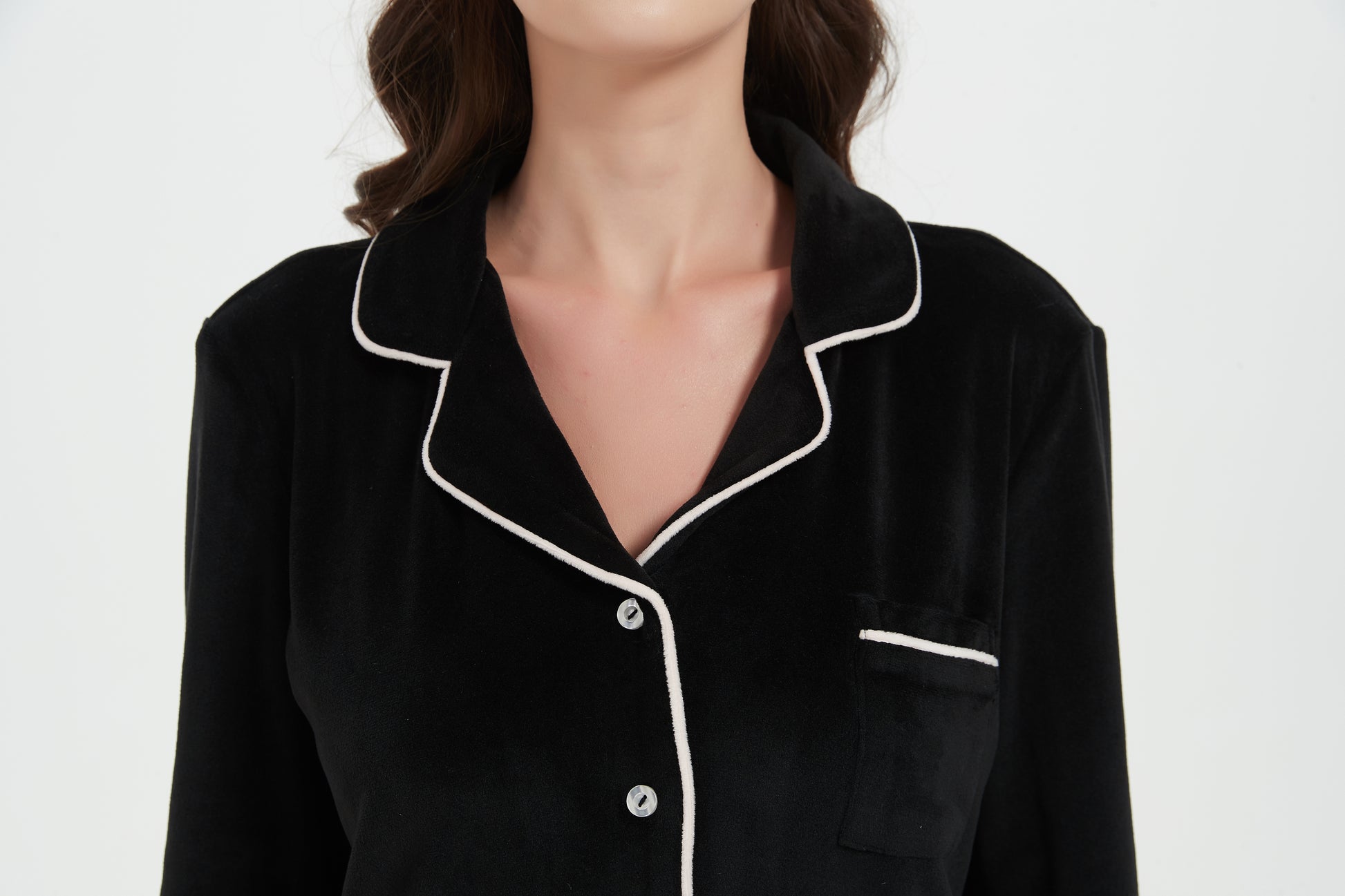 - Shirt: Notch collar contrast binding button front, long sleeves and pocket.