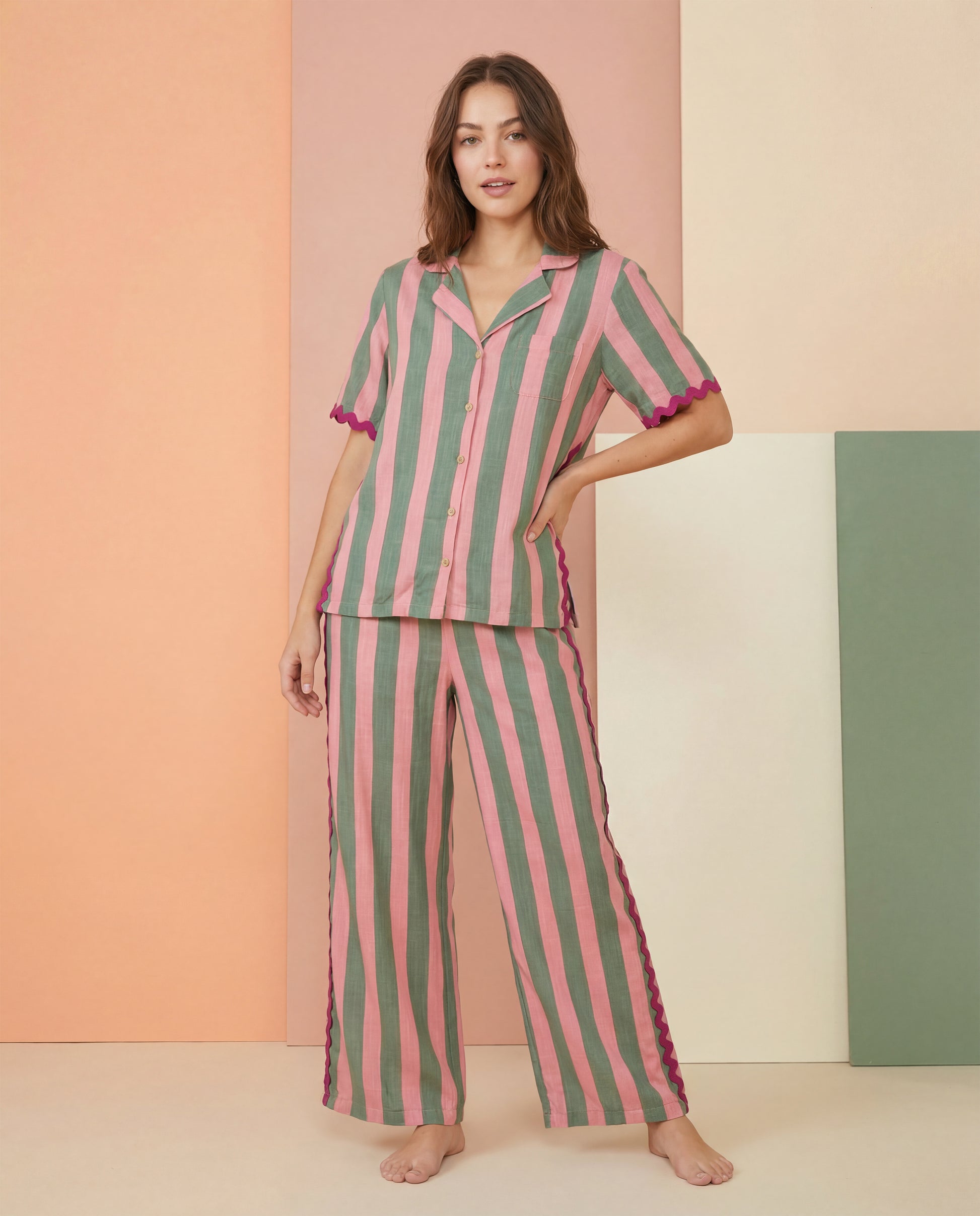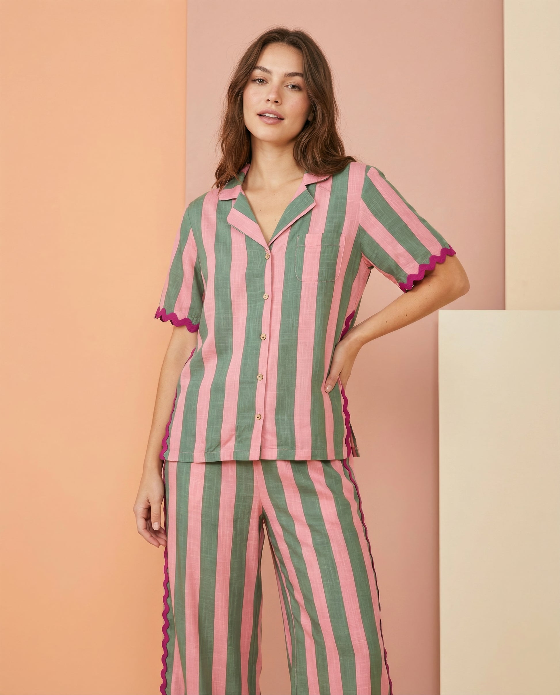Designed with a short-sleeve boxy notch-collar button-front top and a coordinating wide-leg pant, the Watermelon Stripe Ric Rac Pajama Set delivers bold, playful sleepwear with an elevated, fashion-forward edge.