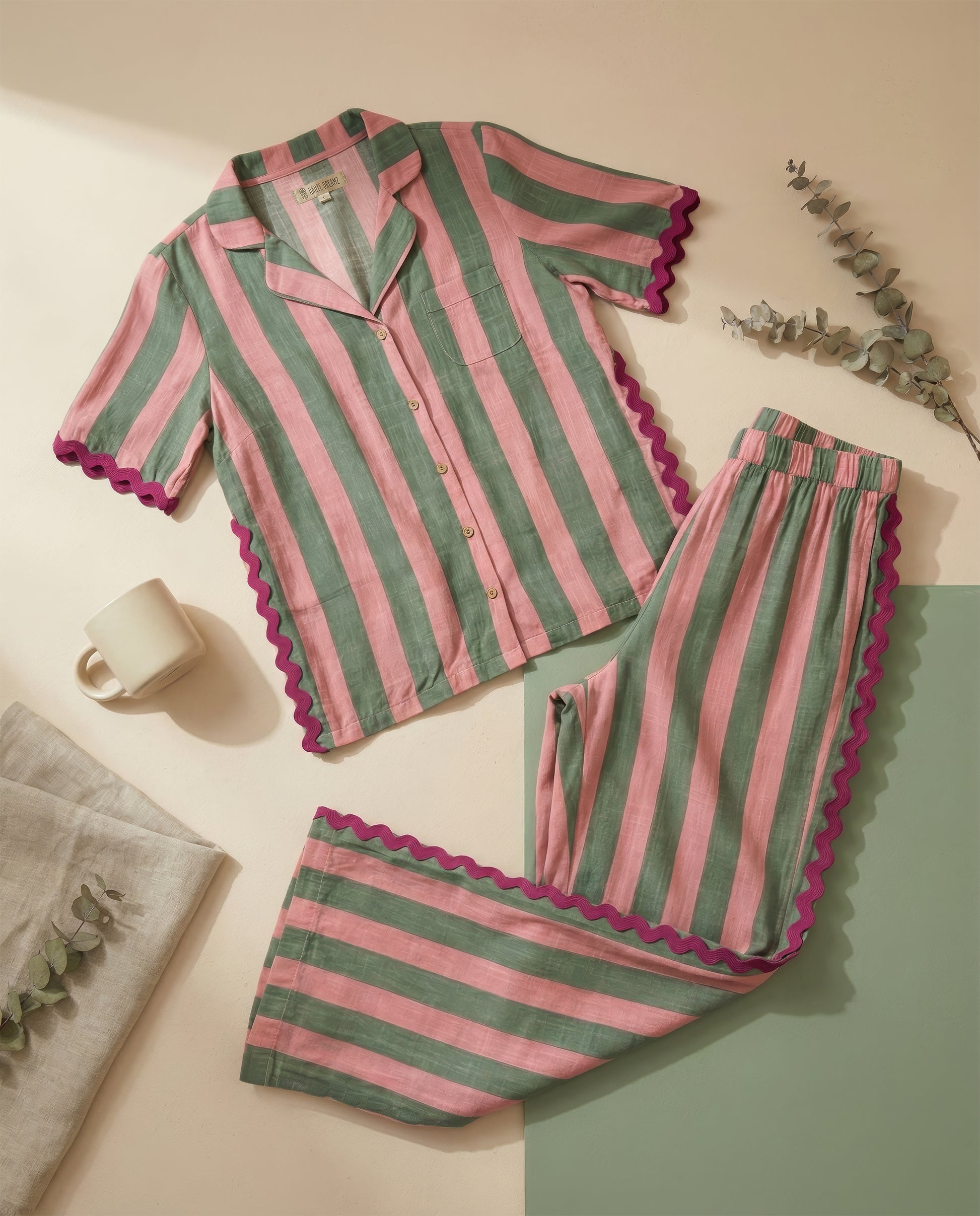 Designed with a short-sleeve boxy notch-collar button-front top and a coordinating wide-leg pant, the Watermelon Stripe Ric Rac Pajama Set delivers bold, playful sleepwear with an elevated, fashion-forward edge.